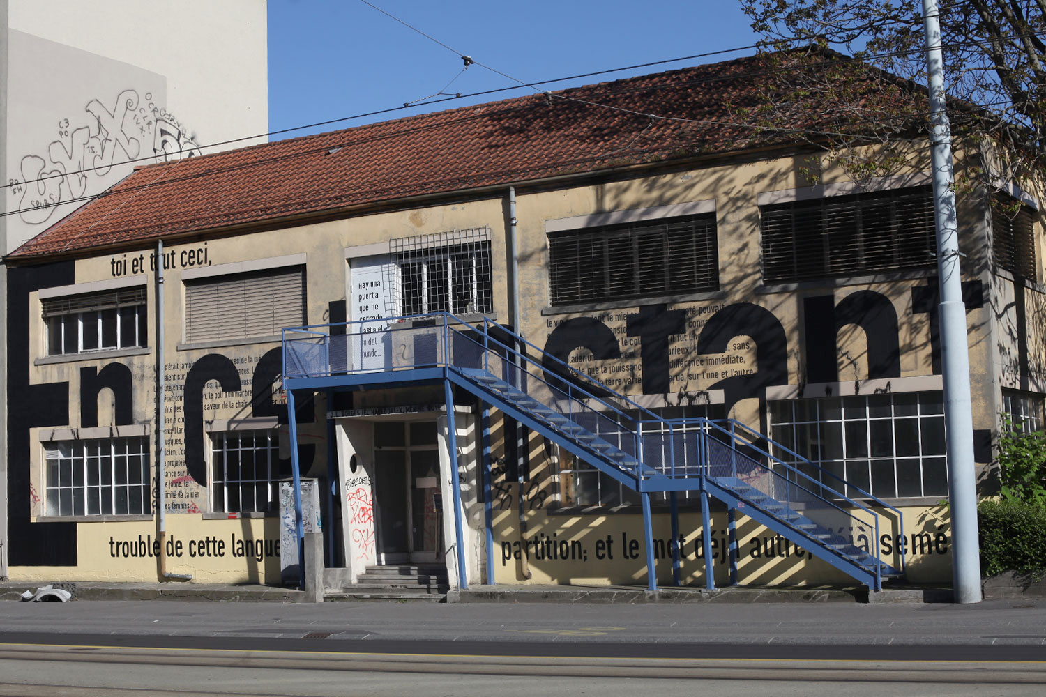 Situé en plein cœur du projet de transformation urbaine Praille-Acacias-Vernets (PAV) dans le futur quartier de l’Étoile, le 76 Acacias fut le premier bâtiment à être occupé de manière transitoire par Ressources Urbaines juste après sa création en 2016, grâce à une mise à disposition de l’État de Genève (bail temporaire entre 2016 et 2022). À ses débuts, le projet offrait une grande salle pour des réunions et des expositions ainsi qu’un Commun. Une fresque murale a été réalisée en avril 2019 sur la façade nord du bâtiment par l’auteure Karelle Menine avec l’aide de l’artiste Iona Suzuki, d’après des textes de Karelle Menine et des citations de Jorge Luis Borges. Cette même année, un escalier extérieur a été réalisé, permettant dès lors un usage du 1er étage. Y ont travaillé les porteur-x-euses de projets d’architecture et d’urbanisme Largescalestudio et Urbz, les illustratrices Poppy Matigot et Joëlle Schindelholz, le dessinateur de BD Herji, le comédien et metteur en scène Jean-Louis Johannides ainsi que le collectif d’artistes et scénographes Ceres.<br /> <br /> Crédit photo : Delphine Luchetta