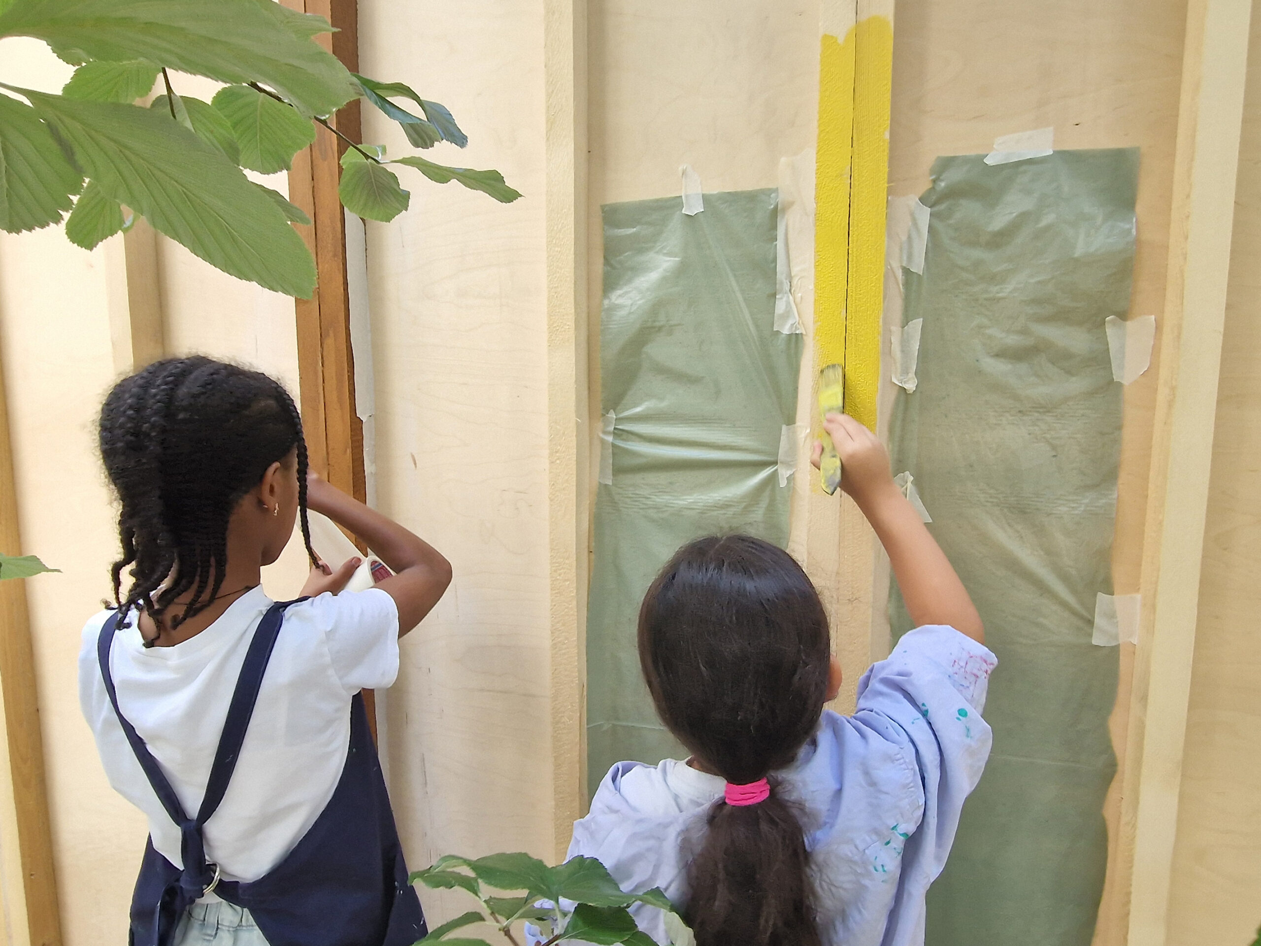 Après une série de workshops en 2023 et 2024, la maquette d’une jeune participante a été retenue comme base du pavillon. Un autre atelier a permis d’en développer une version à l’échelle 1/5e. La réalisation du pavillon et sa mise en couleur a été réalisée avec des enfants du quartier en août 2025.
